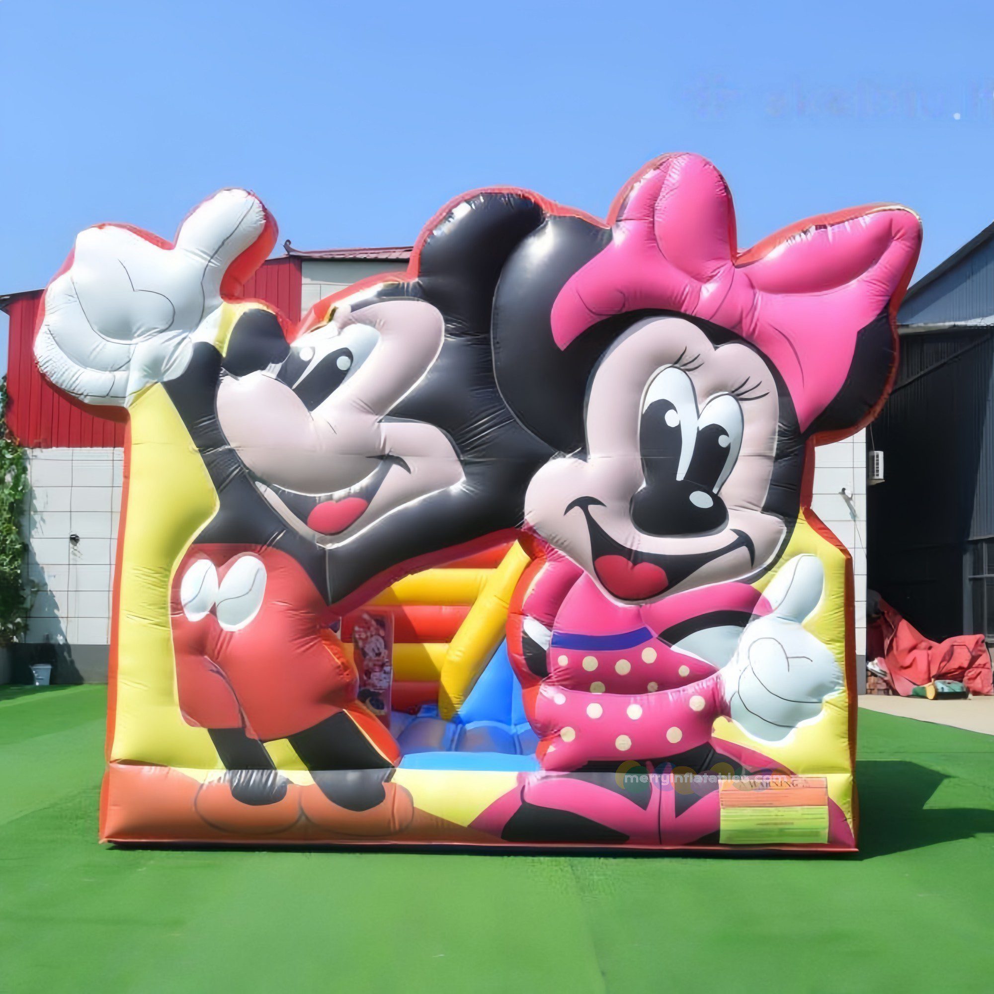 Mickey & Minnie themed inflatable bounce house with slide. Designed especially for children, this fun inflatable playground combines jumping, climbing, and sliding in one exciting attraction. The adorable cartoon characters instantly capture kids’ attention and make it a perfect centerpiece for parties, amusement parks, rental businesses, and family entertainment centers.
