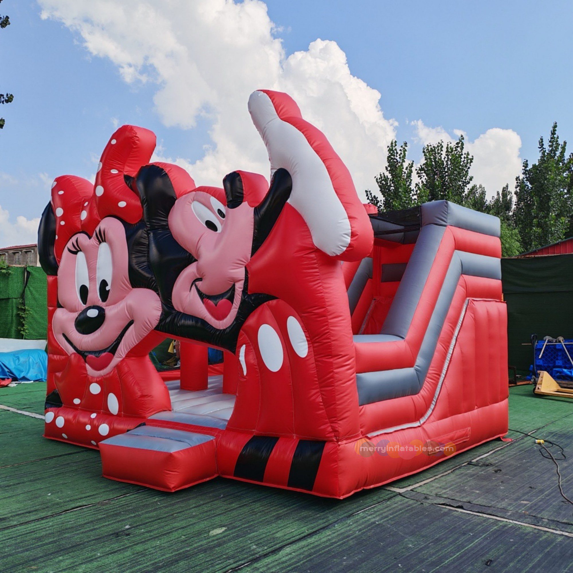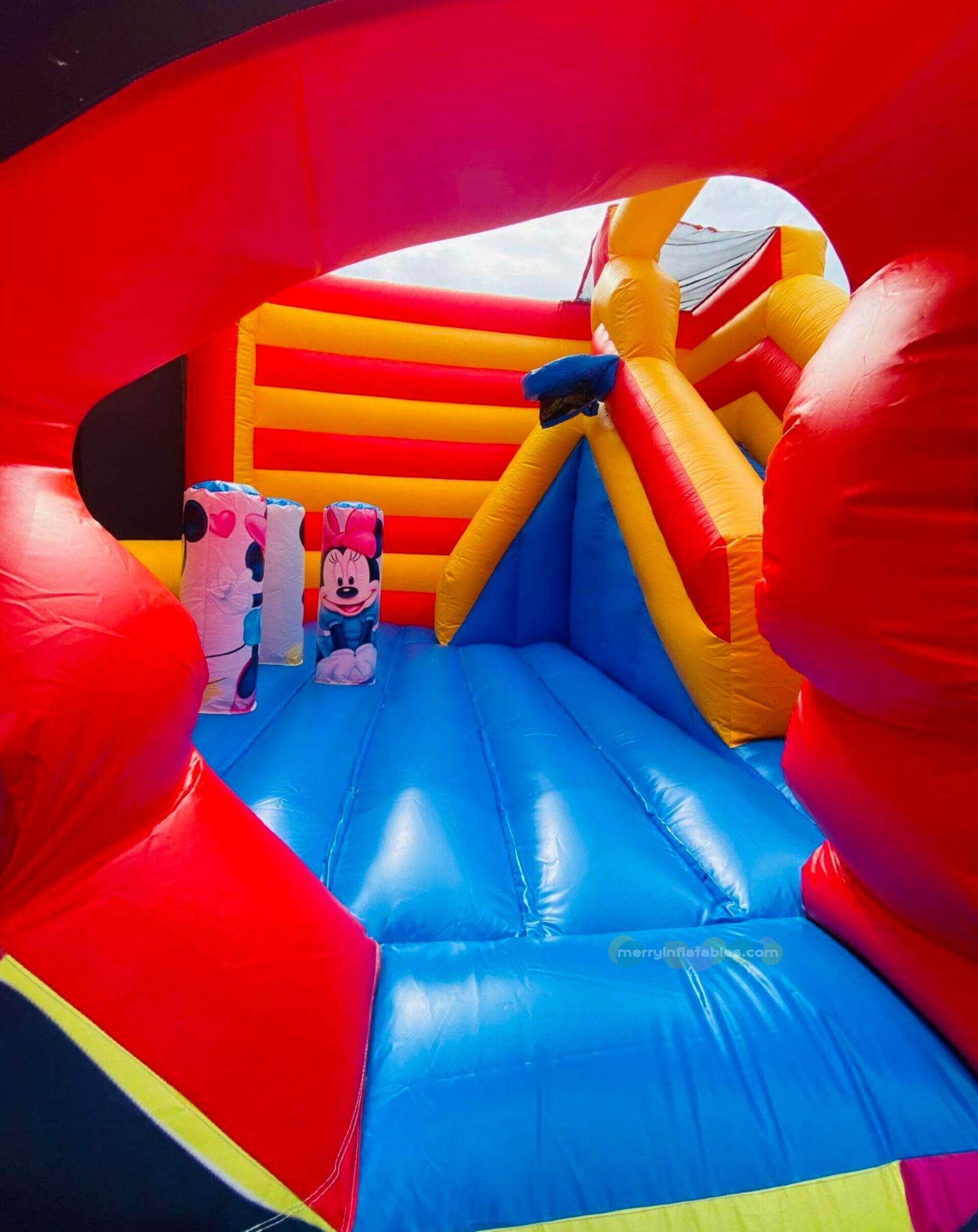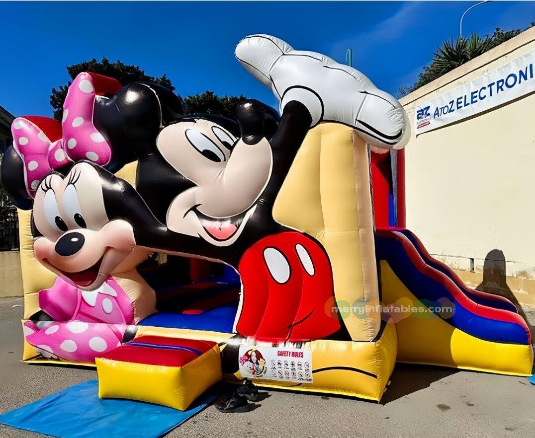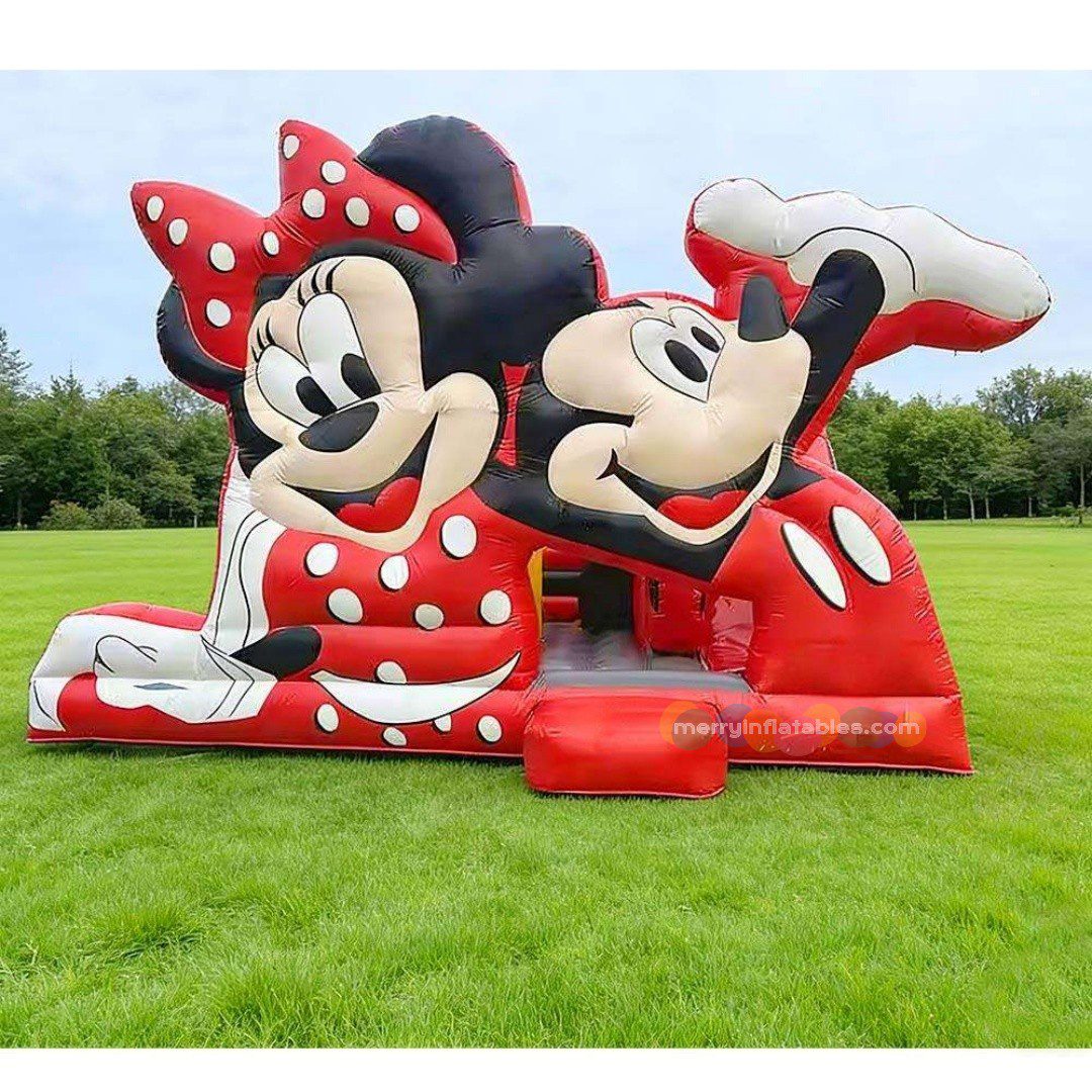 Mickey & Minnie themed inflatable bounce house with slide. Designed especially for children, this fun inflatable playground combines jumping, climbing, and sliding in one exciting attraction. The adorable cartoon characters instantly capture kids’ attention and make it a perfect centerpiece for parties, amusement parks, rental businesses, and family entertainment centers.